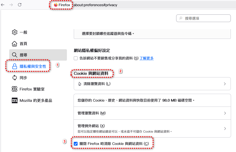 可以參考以Firefox瀏覽器為例,關閉瀏覽器後就清空cookies;讓管理頁面可以順利登入。