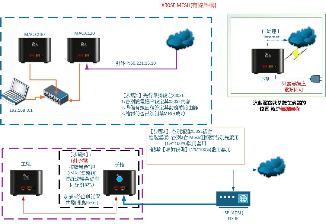 【Mesh網路】X30SE 如何架設有線回程(Ethernet Backhaul )方式佈建Mesh網路?《5232》 請參考適用型號: X30SE 【Mesh網路】X30SE 如何架設有線回程(Ethernet Backhaul )方式佈建Mesh網路? 範本:建置架構圖 返回上頁