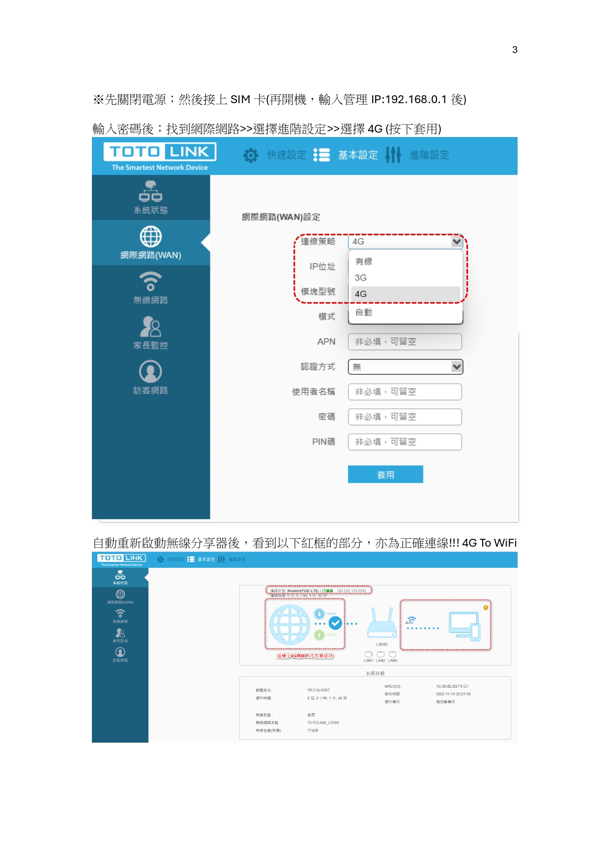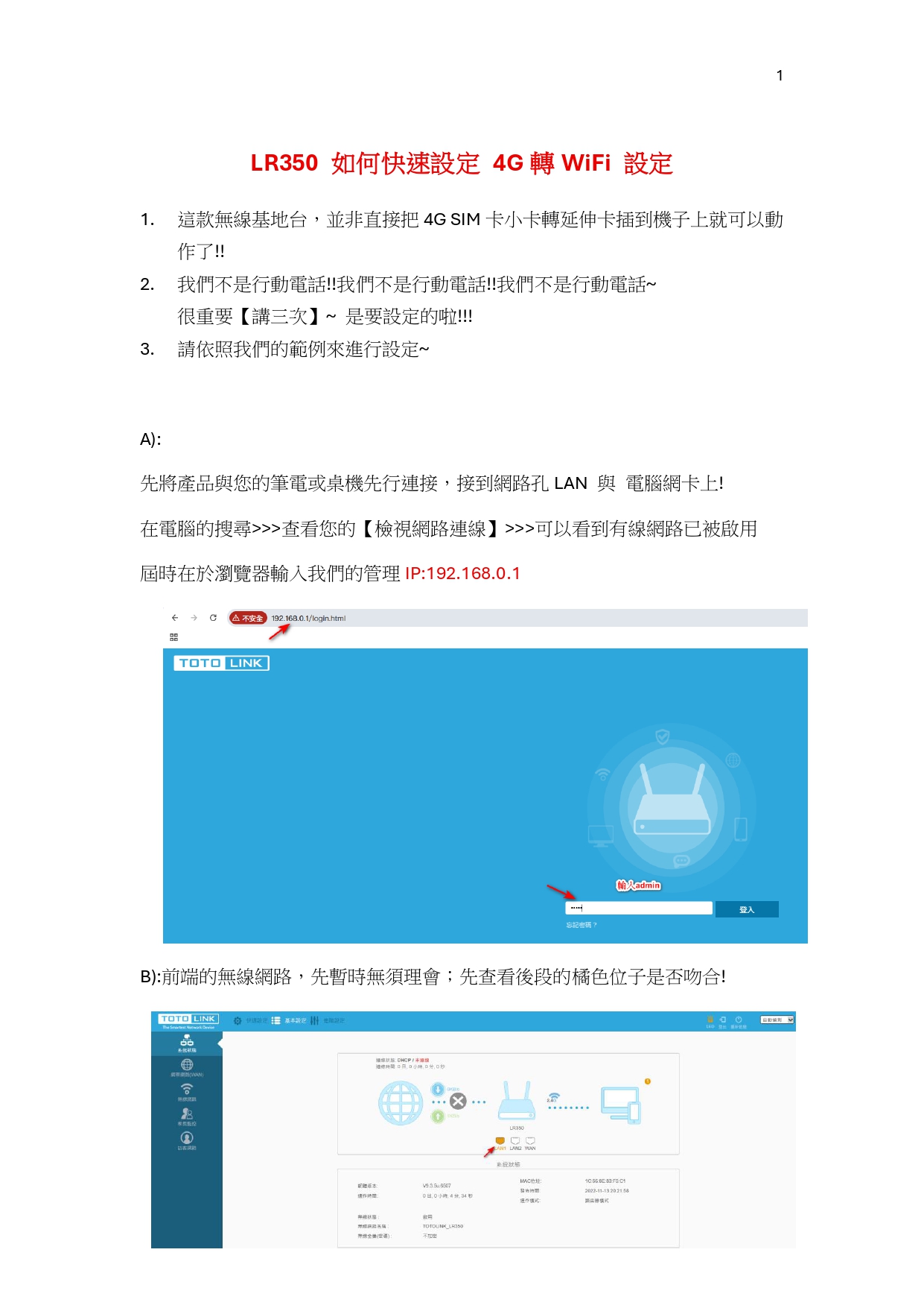 【產品說明】LR350 SIM卡由4G 轉 WiFi訊號 設定方法SOP《3504》 請參考適用型號: 4G 分享器 | LR350 【產品說明】LR350 SIM卡由4G 轉 WiFi訊號 設定方法SOP (如下操作) 返回上頁
