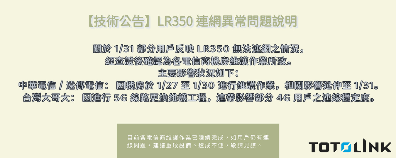 發佈日期: 2026-02-02 ▲115/01/27~115/02/02期間 4G訊號導致SIM卡接收異常 ★親愛的用戶您好,攸關LR350產品SIM卡片無法接收到訊號爭議 係因多日查訪,為國內三大電信業者紛紛汰換饋線和機房整治, 因原本3G訊號升級為4G訊號,後又因國內紛紛發照為5G訊號 故即將4G訊號逐漸汰換為5G訊號,4G訊號仍存在視為其第二。 4G訊號與5G訊號的優先順序,仍為三大電信業者考量之重點!! 近日如附加圖檔佐證;造成北、中、南 各基地台整治,未明確公告 導致眾多廣大TOTOLINK客戶反映某款產品遭受影響, 我司暫保留相關權益追述權及名譽問題!! 以上;釐清問題始末,盼能持續支持TOTOLINK系列產品!! 造成不便請多見諒!!