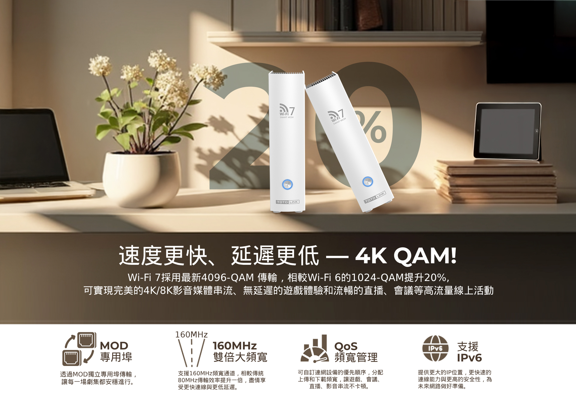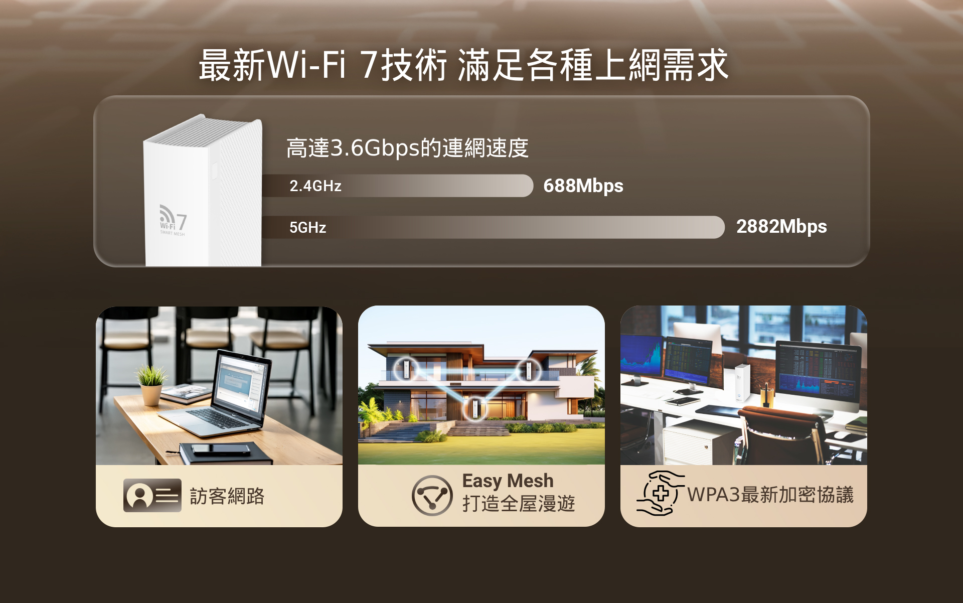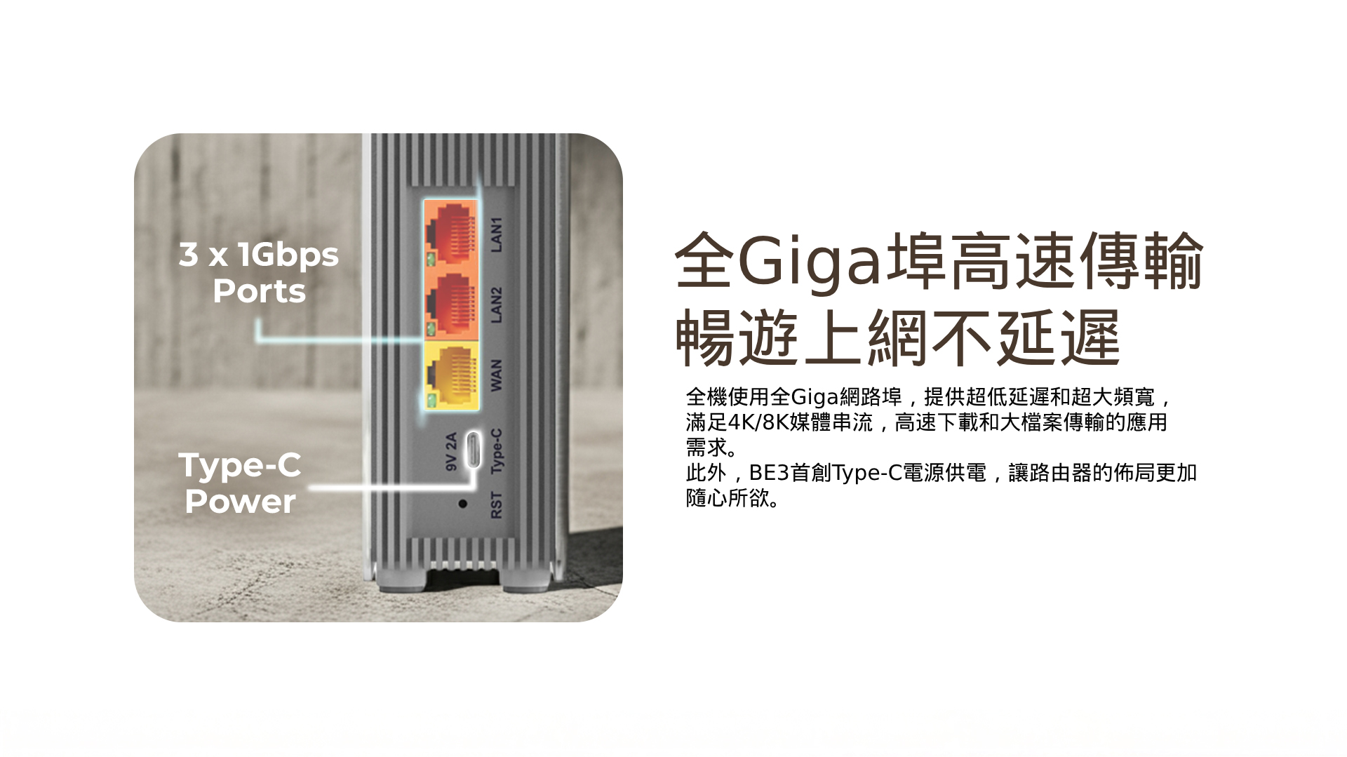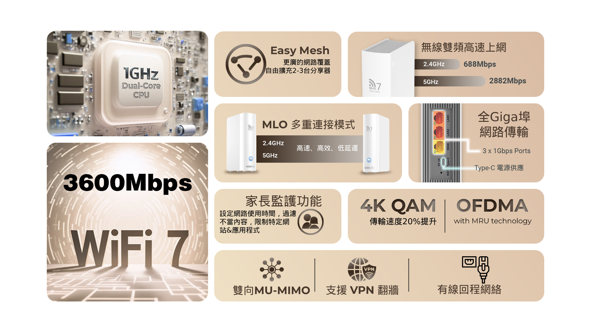 WiFi7 BE3600雙頻-傳輸速度 5G 2882Mbps +2.4G 688Mbps。 EasyMesh組網功能,輕鬆實現 Wi-Fi 擴充和無縫漫遊。 MLO多重連結模式,跨頻段傳輸上網,有效降低延遲並提升網路吞吐量。 4K-QAM技術,帶來更高的數據傳輸率,效率提升20%。 全機配置1Gbps Giga有線網路埠,傳輸不掉速。 最新 WPA3 加密技術,嚴密守護上網資安 。 OFDMA 和 MRU 技術,有效提升資料傳輸效率並降低延遲。 Beanforming波束成形技術,連接更穩定。 首創Type-C介面供電,網路佈線更多元。 支援 VPN 翻牆、中繼網路、訪客網路、QoS頻寬管理和分享器定時重啟 。 家長監護功能,讓您輕鬆管理任何連接裝置上的內容和線上時間。