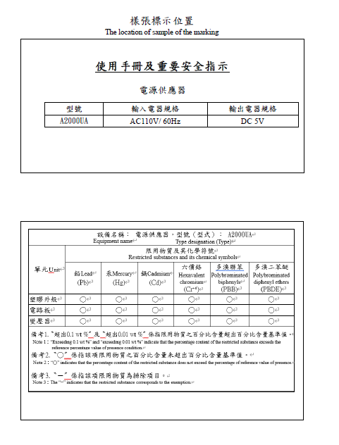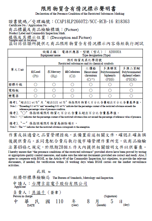 發佈日期: 2021-08-12 A2000UA 超世代無線網卡聲明書 為確保消費者使用安全與權益,及對環保意識的重視,依經濟部標準檢驗局檢驗標準 CNS 15663 第 5 節 「含有標示」之規定將限用物質含有情況之查詢連結提供於本網頁,供消費者自行查詢。下方附件為型號 A2000UA 超世代無線網卡 之限用物質含有情況聲明書。