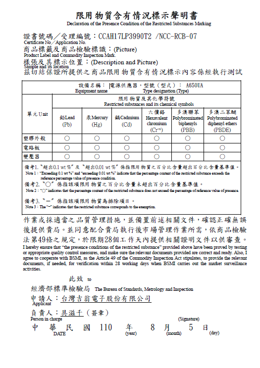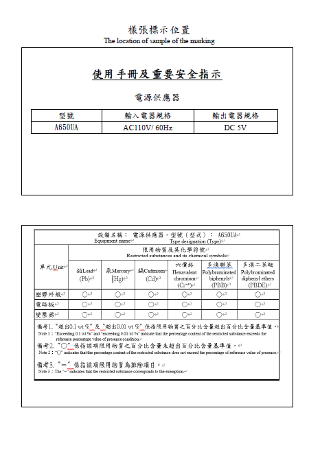 發佈日期: 2021-08-12 A650UA AC650雙頻無線USB網卡聲明書 為確保消費者使用安全與權益,及對環保意識的重視,依經濟部標準檢驗局檢驗標準 CNS 15663 第 5 節 「含有標示」之規定將限用物質含有情況之查詢連結提供於本網頁,供消費者自行查詢。下方附件為型號 A650UA AC650雙頻無線USB網卡 之限用物質含有情況聲明書。